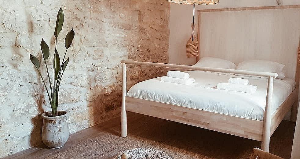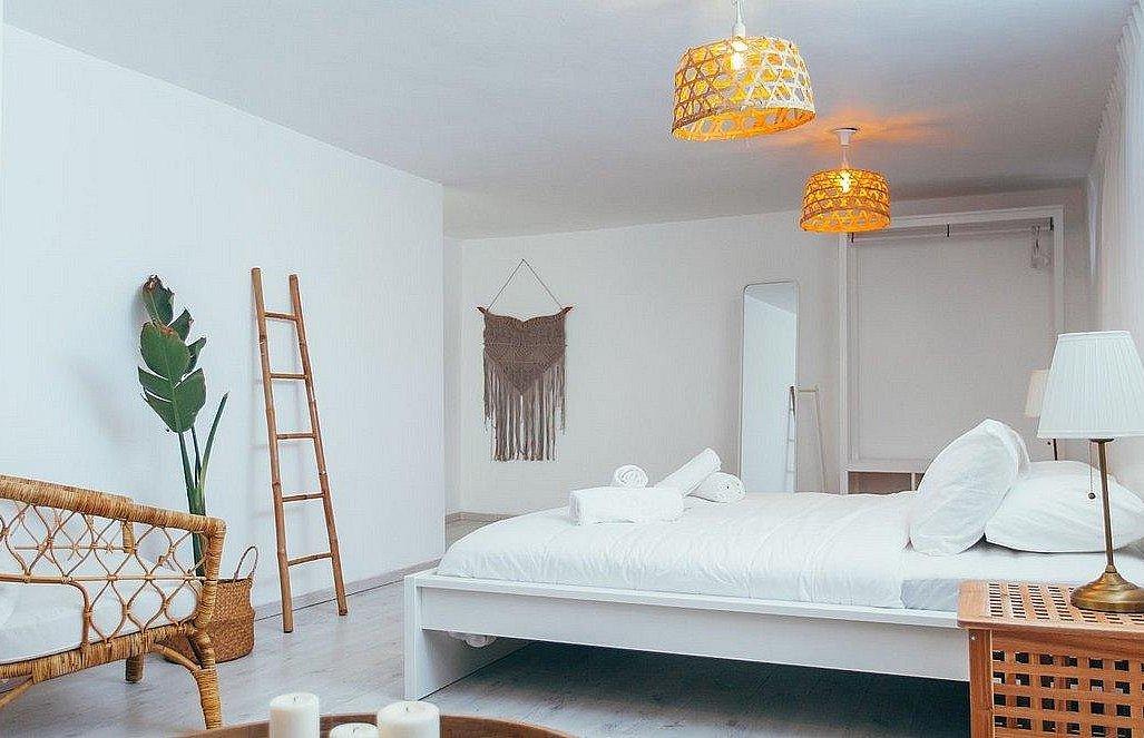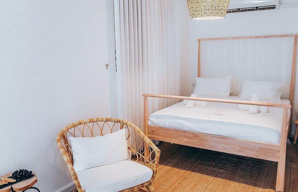 חדר שינה הכולל מיטה זוגית מוצעת וארון לאחסון