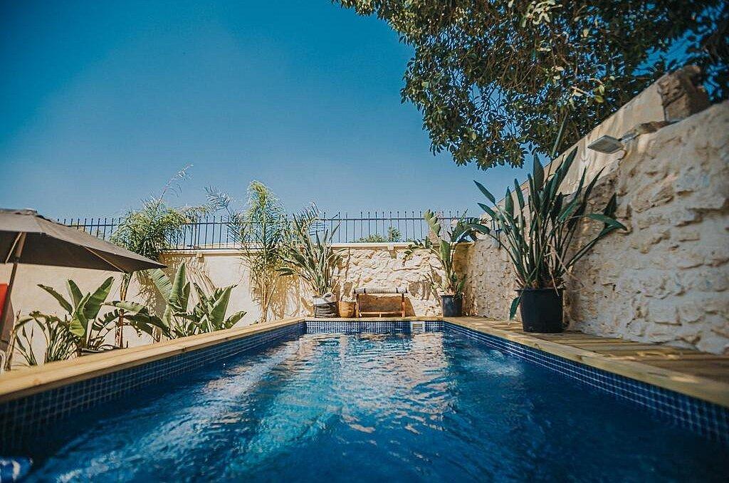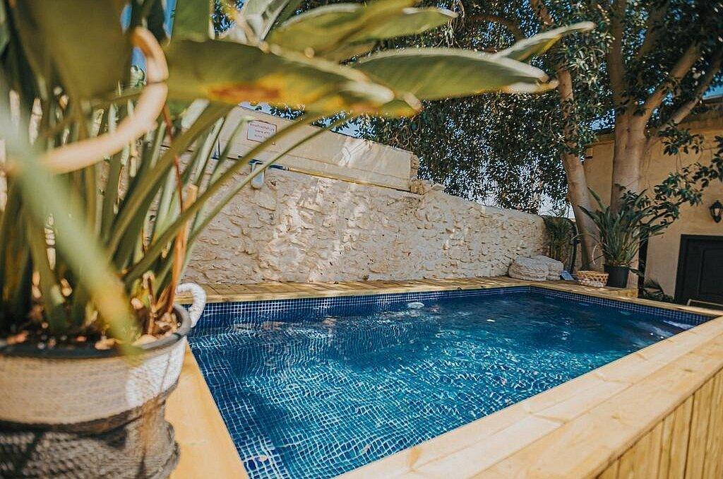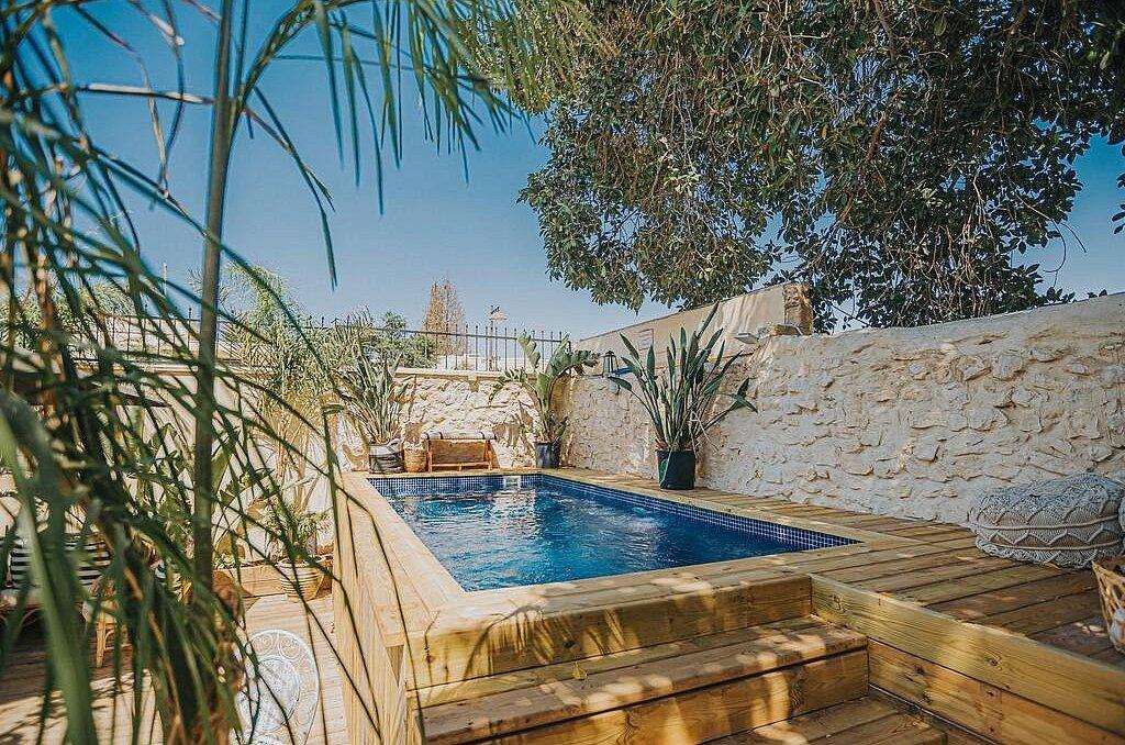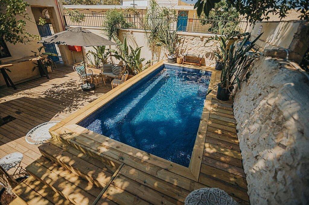 בריכת שחייה מחוממת מעוטרת ברצפת דק איכותי גודל הבריכה 2 וחצי על 5