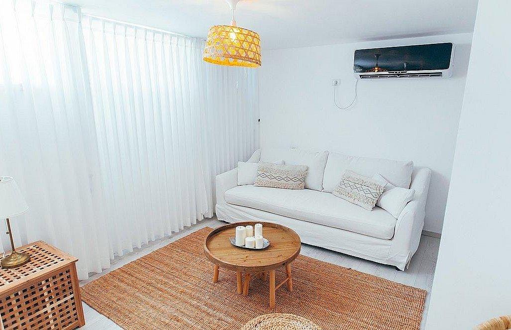ספה ולצידה מסך צפייה LCD 50 אינץ ומערכת סאונד