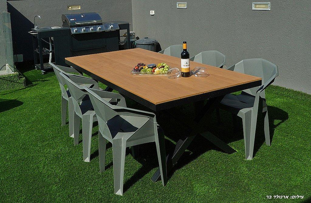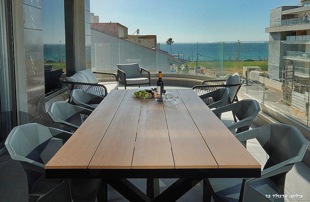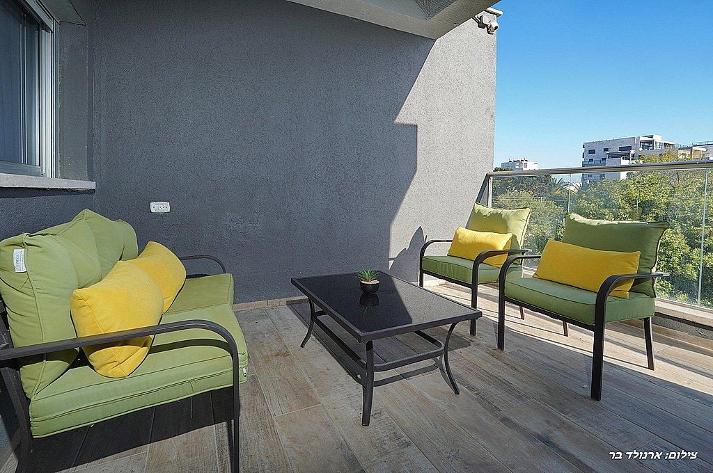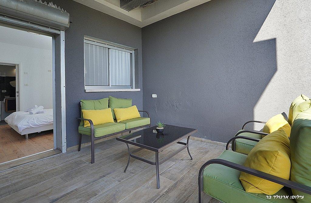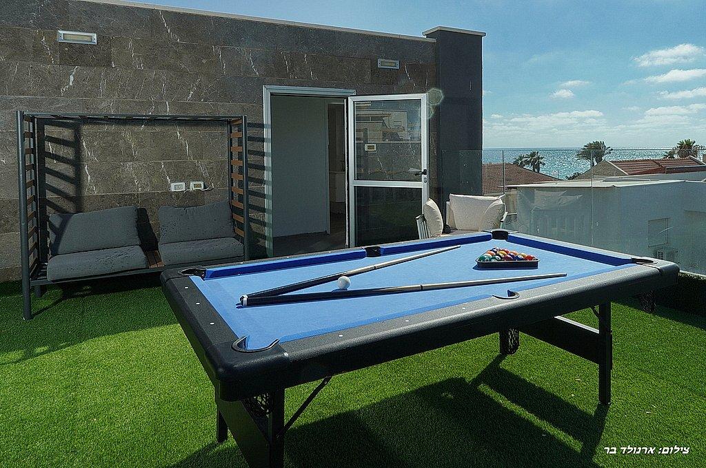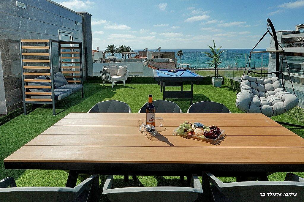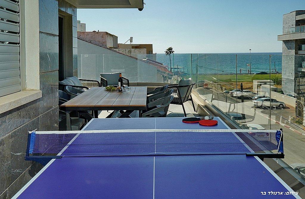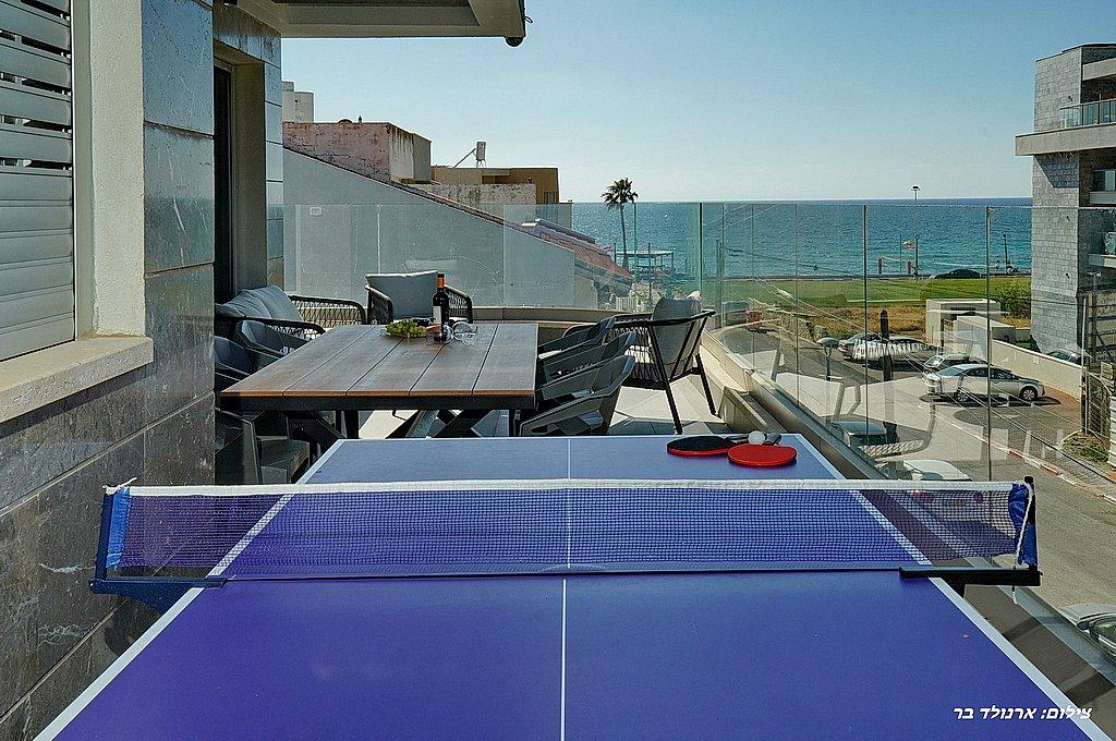מרפסת מרכזית מהסלון עם פינות ישיבה ושולחן פינג פונג
