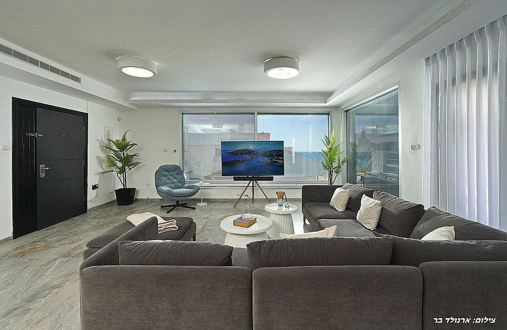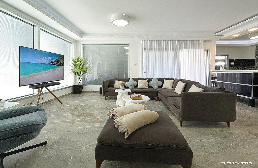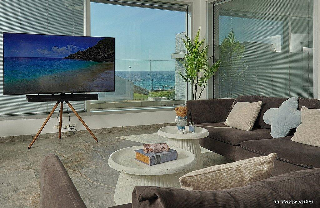 סלון רחב ומפואר הפונה לים עם טלוויזיה חכמה ומערכת קולנוע ביתית