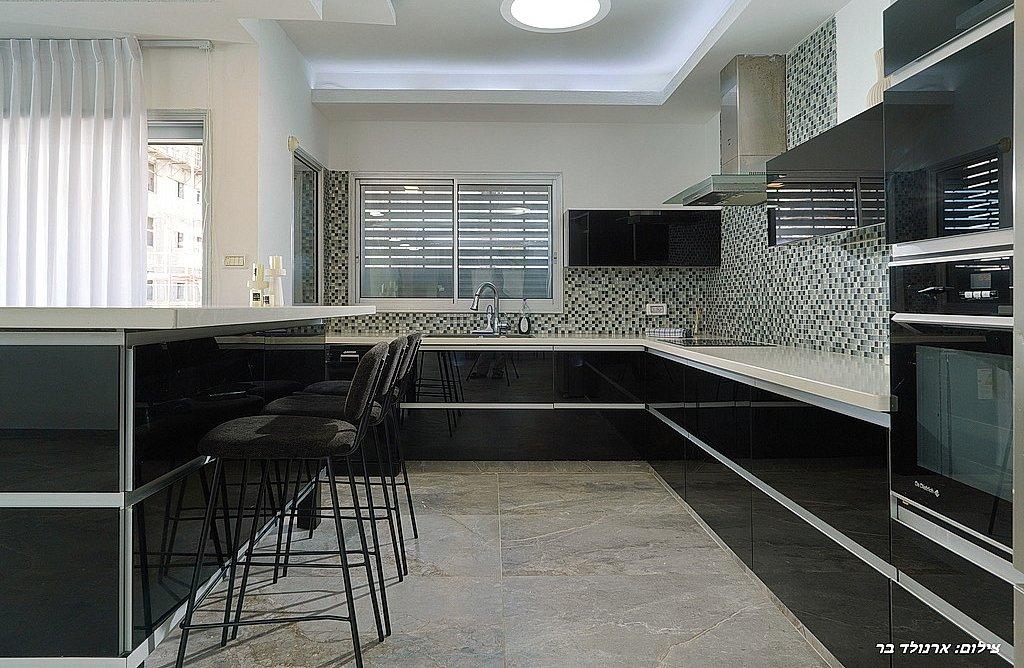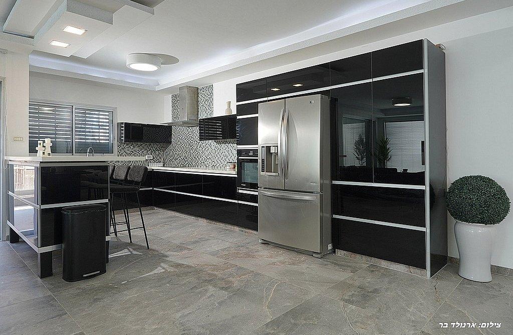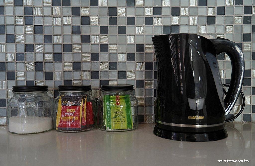 מטבח מאובזר הכולל מקרר ענק, תנור, מיקרוגל, מיני בר, קומקום, כיריים חשמליות, כלי בישול והגשה