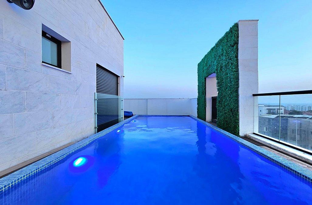 מרפסת עליונה - בריכת שחייה מחוממת (35 מעלות) בגודל 9 על 3.5 מטר, מיטות שיזוף, פינת ישיבה ונוף מרהיב