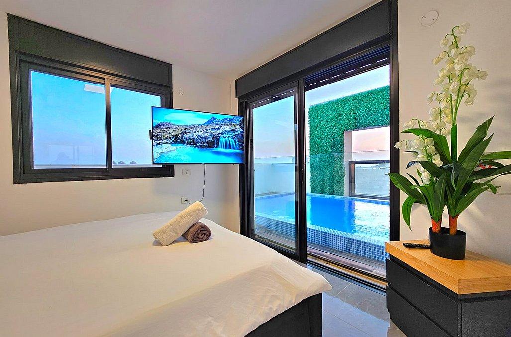 חדר שינה 3 - מיטה זוגית, מיזוג אוויר, טלוויזיה ונוף אל הבריכה