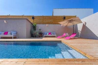 חצר גדולה עם מתחם דק ובריכת שחייה