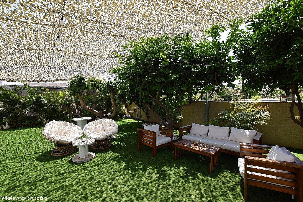 מטבח חוץ מאובזר הכולל: משטח עבודה, מקרר, כיריים גז, מנגל פחמים