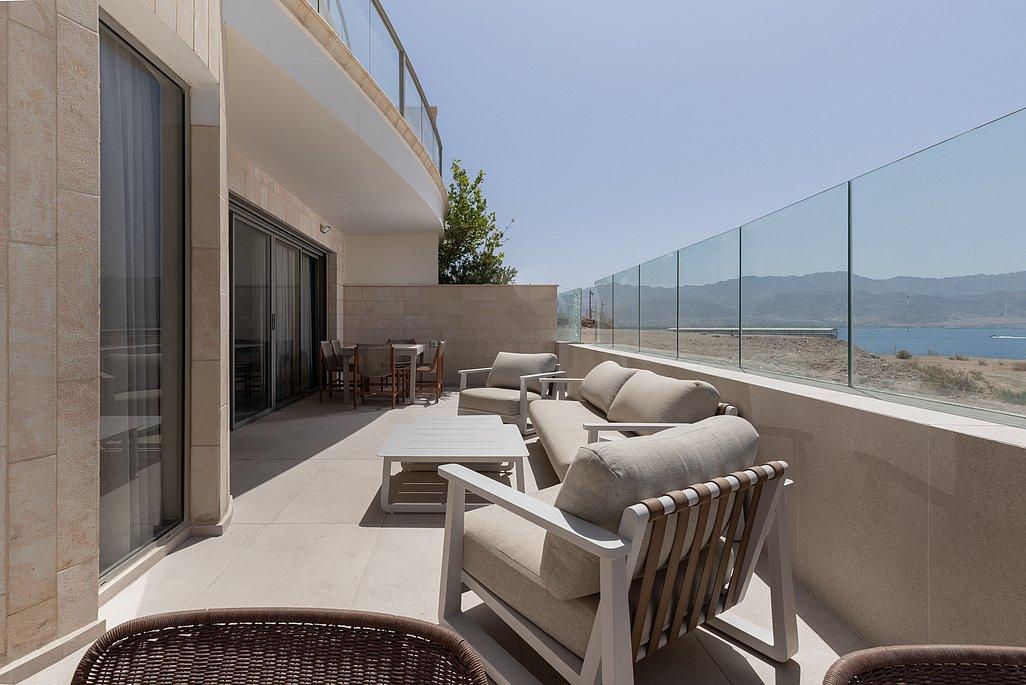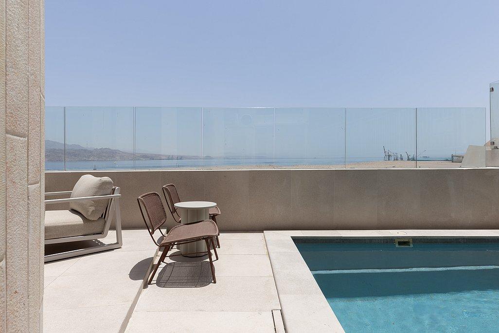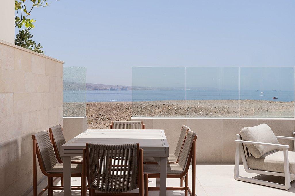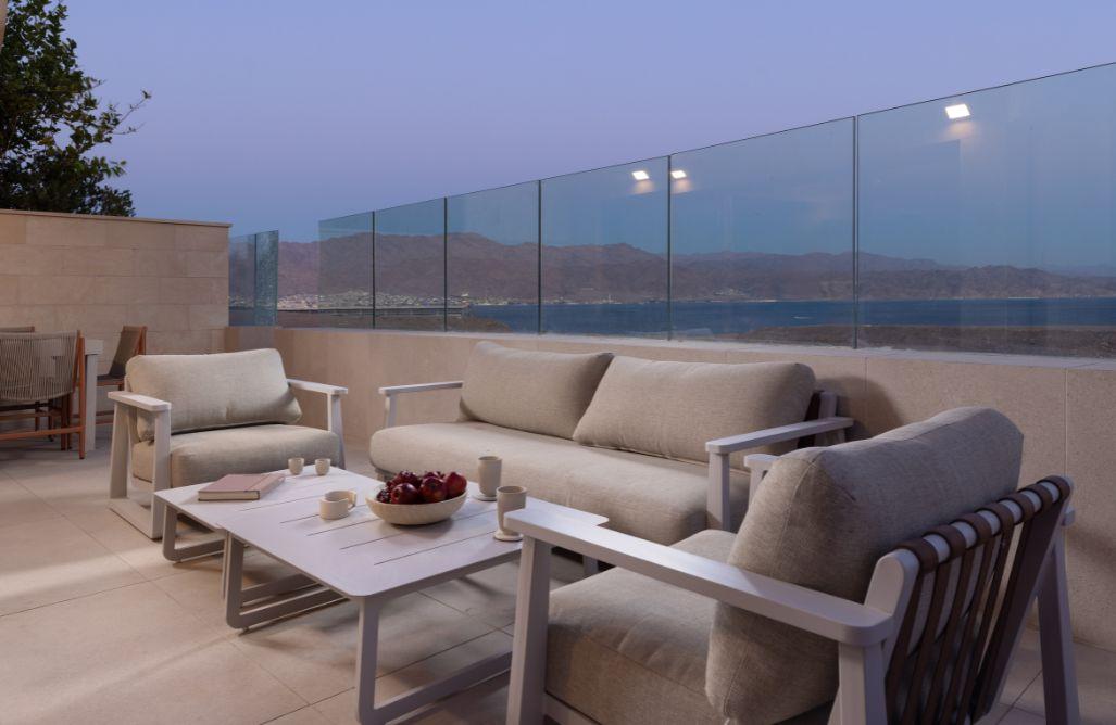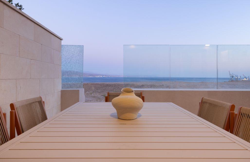 - מיטת שיזוף, ריהוט גן ופינת ישיבה מול נוף לים