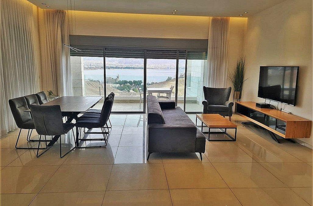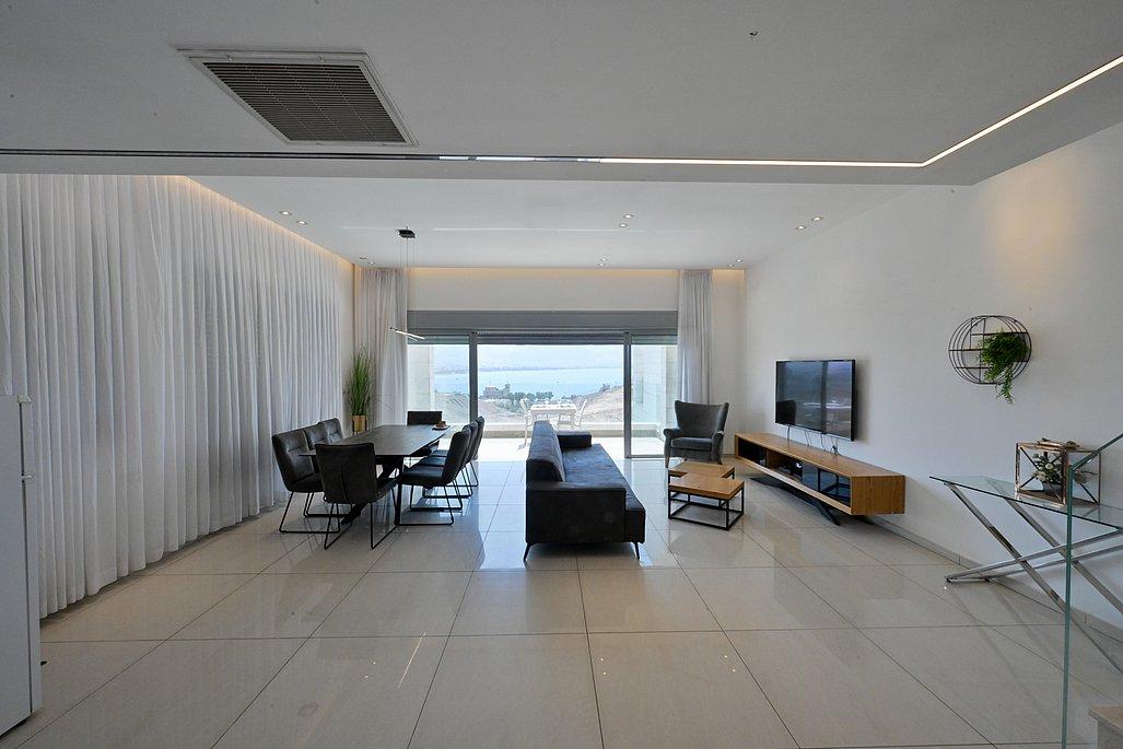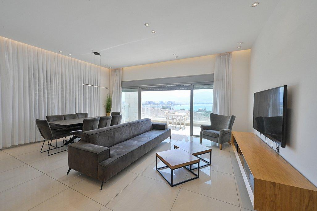 סלון מעוצב עם מערכת ישיבה נוחה וטלוויזיה
